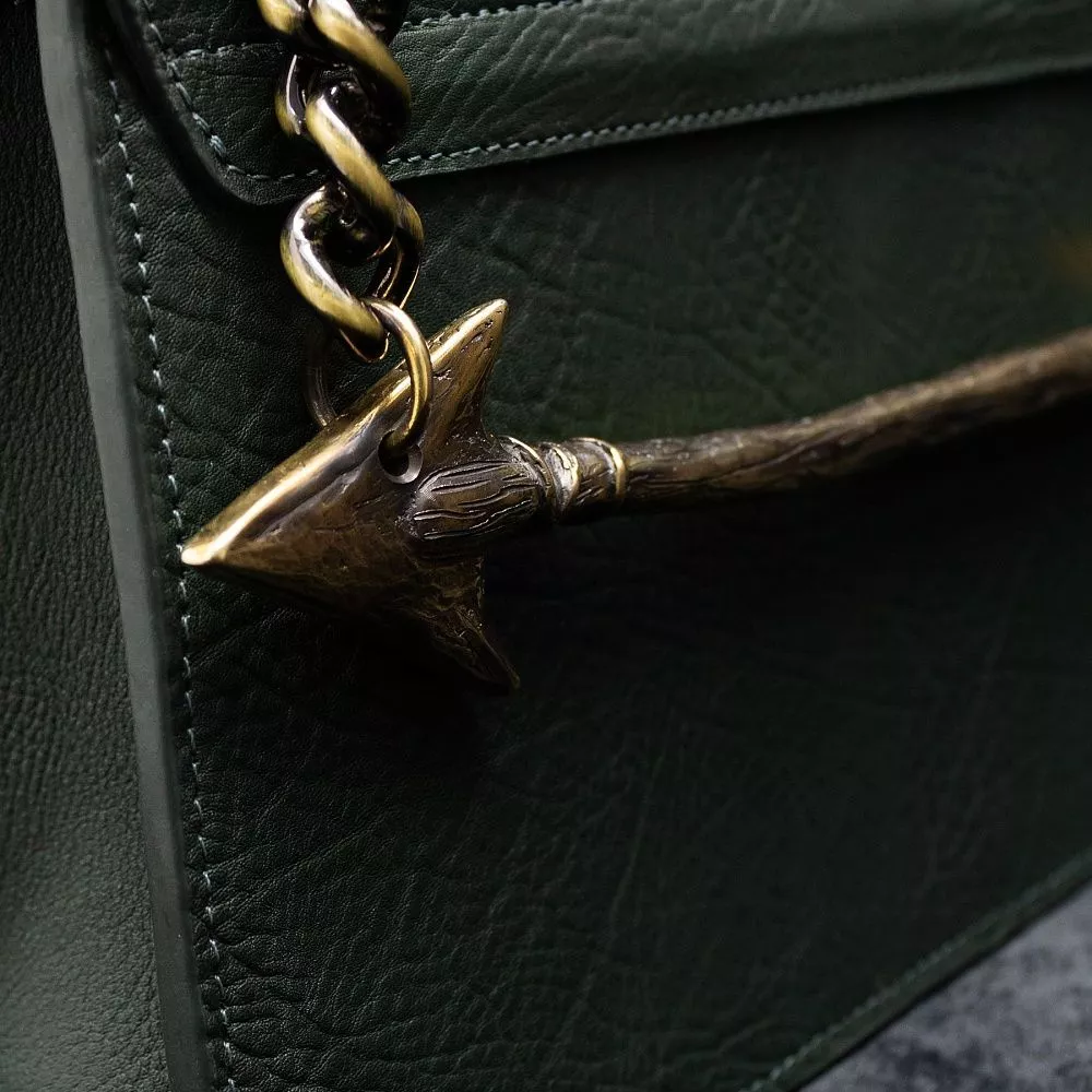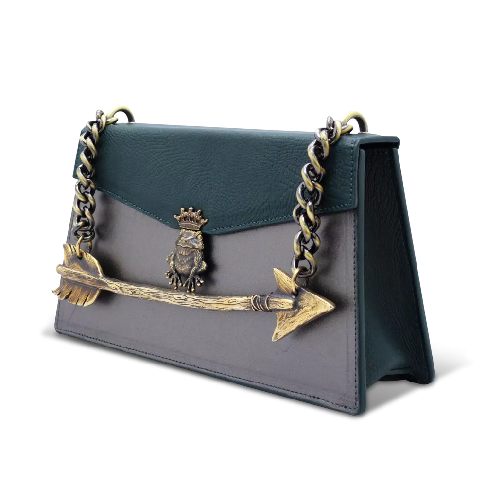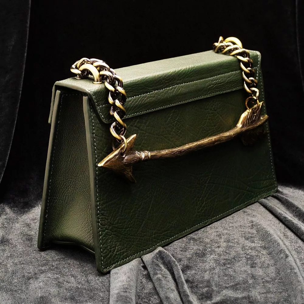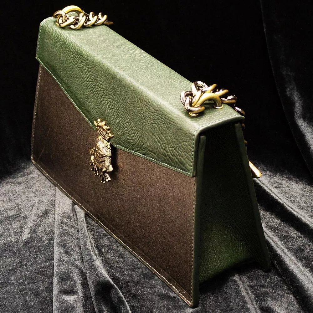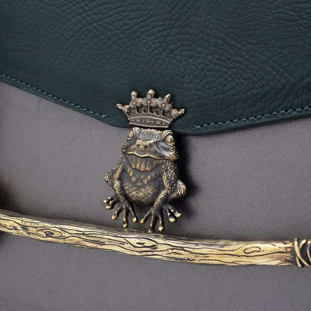 Женская сумочка «Царевна-лягушка» создана по индивидуальному проекту. Кожа двух разных фактур зеленого оттенка. В сумочке предусмотрено множество отделений и сохранен компактный размер для удобного ношения. Акцент изделия — на фурнитуре, которая выполняется методом художественного литья по авторским моделям с применением разнообразных технологий обработки. Нижняя часть замочка изображает лягушку, верхняя — корону царевны. Ручка выполнена в виде стрелы, поддерживаемой цепочкой. Фурнитура запатинирована; по желанию заказчика можно выбрать различные виды гальванического покрытия и менять цвет и вид кожи.