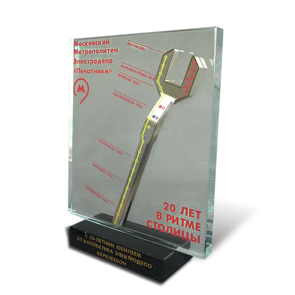 «GiftArtel» изготавливает наградные сувениры. Представленное изделие имеет лаконичное оформление. Все надписи и изображения нанесены на стеклянную поверхность с помощью УФ-печати. Стилизованный гаечный ключ выполнен из металла, подставка – из камня. Формы сувенира и постамента разработаны опытными дизайнерами в индивидуальном порядке. Вы можете заказать подарок, выполненный в похожем стиле.