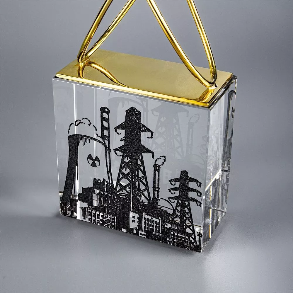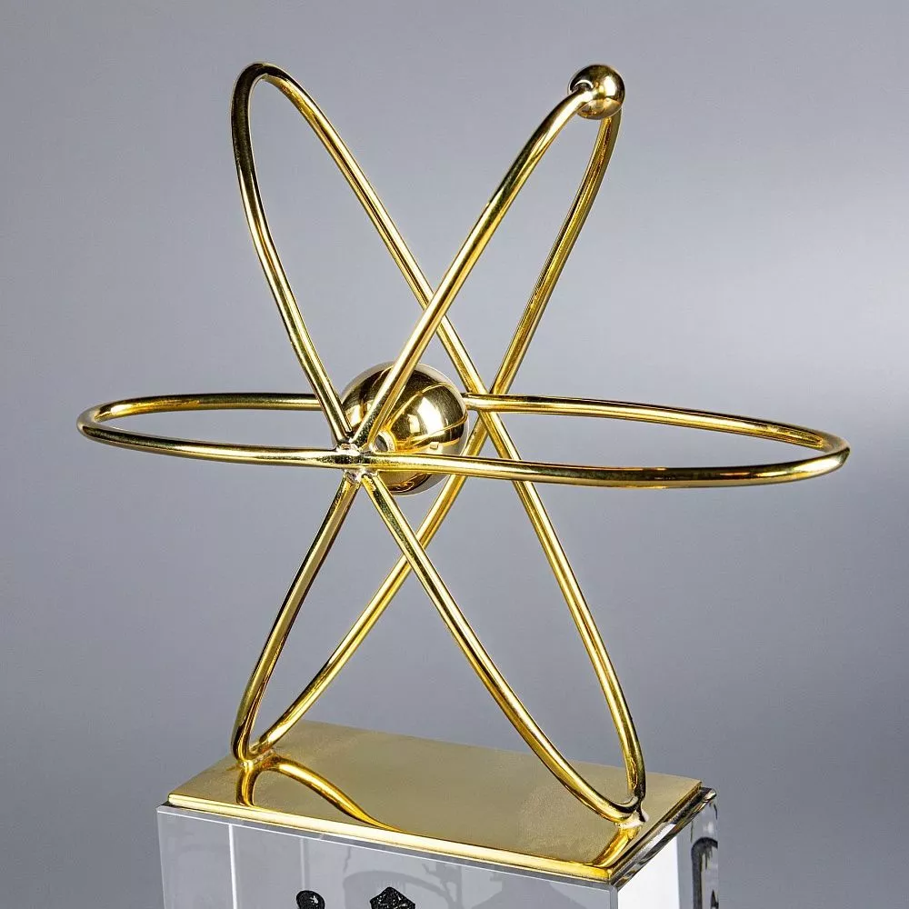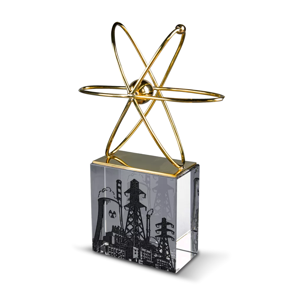 В центре подарочной композиции — фигурка атома с ярко выраженными орбитами, отполированными до золотистого блеска. Постамент выполнен из стекла и украшен темной гравировкой, изображающей технологические здания энергетической отрасли. По желанию заказчика можно заменить изображение или выполнить персонализацию по индивидуальному проекту. Стеклянный постамент придаёт лёгкость и прозрачность, контрастируя с золотистым блеском металла и подчёркивая символику чистоты идей и инноваций.