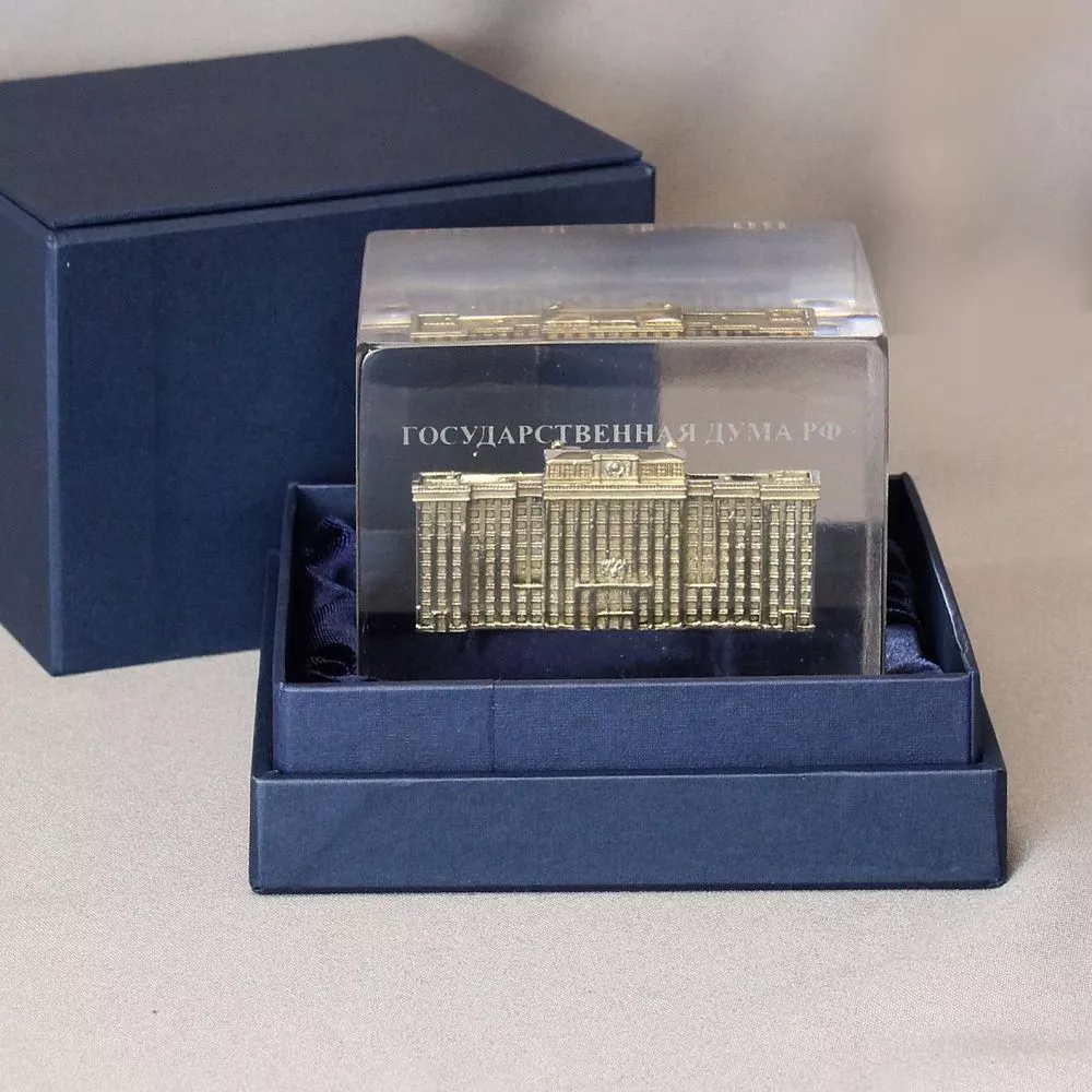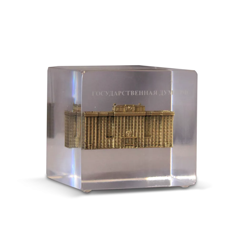 Миникопия аккуратно погружена в прозрачный куб из акрила, при этом форма куба придает изделию монументальность и современный стиль. На лицевой поверхности матовая надпись — это лаконичный и выразительный акцент, который подчеркивает значимость объекта и делает сувенир универсальным.