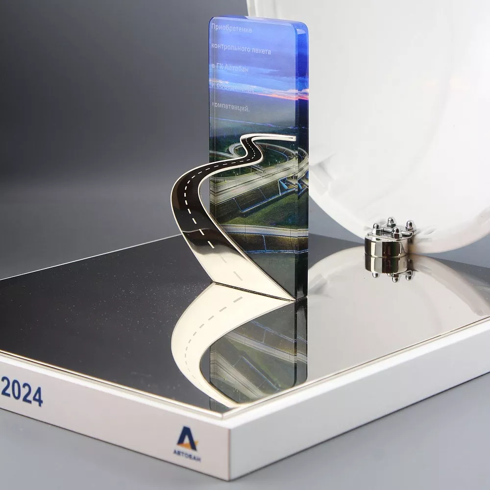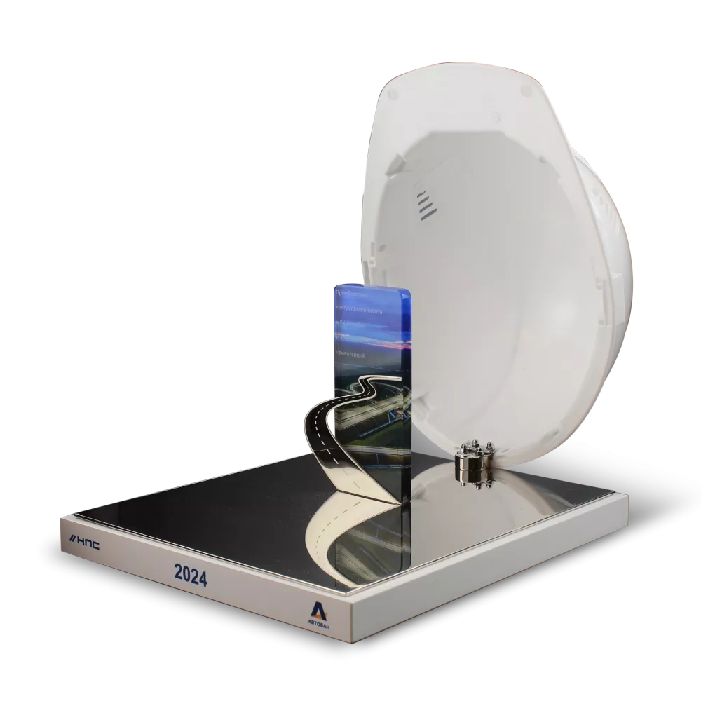 Подарочная инсталляция к Дню дорожного строительства представляет собой современное и символичное произведение. Основание выполнено из белого материала, служащего надежной платформой, на которой расположена полированная металлическая пластина — яркий акцент, подчеркивающий значимость праздника и компании.