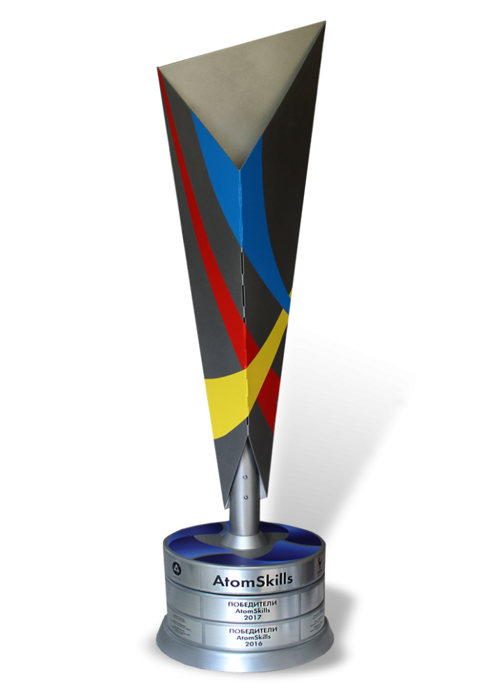 Кубок «Атомскиллз» был изготовлен нами в качестве конкурсной награды для вручения участникам корпоративного мероприятия компании в сфере атомной энергетики. Награда имеет высоту 70 см, выполнена из металла, а все элементы персонификации нанесены на его поверхность посредством технологии ультрафиолетовой печати. Кубок имеет трехъярусное основание с дополнительной подставкой, на торцах основания размещены персонализирующие надписи. Верхняя часть постамента окрашена в синий цвет, а по ее центру укреплен штырь, на котором размещена многоугольная абстракция черного цвета с красными, желтыми и синими полосами. Используя мотивы и решения этого и многих других кубков, мы можем создать новые статуэтки, награды, призы с уникальным дизайном.