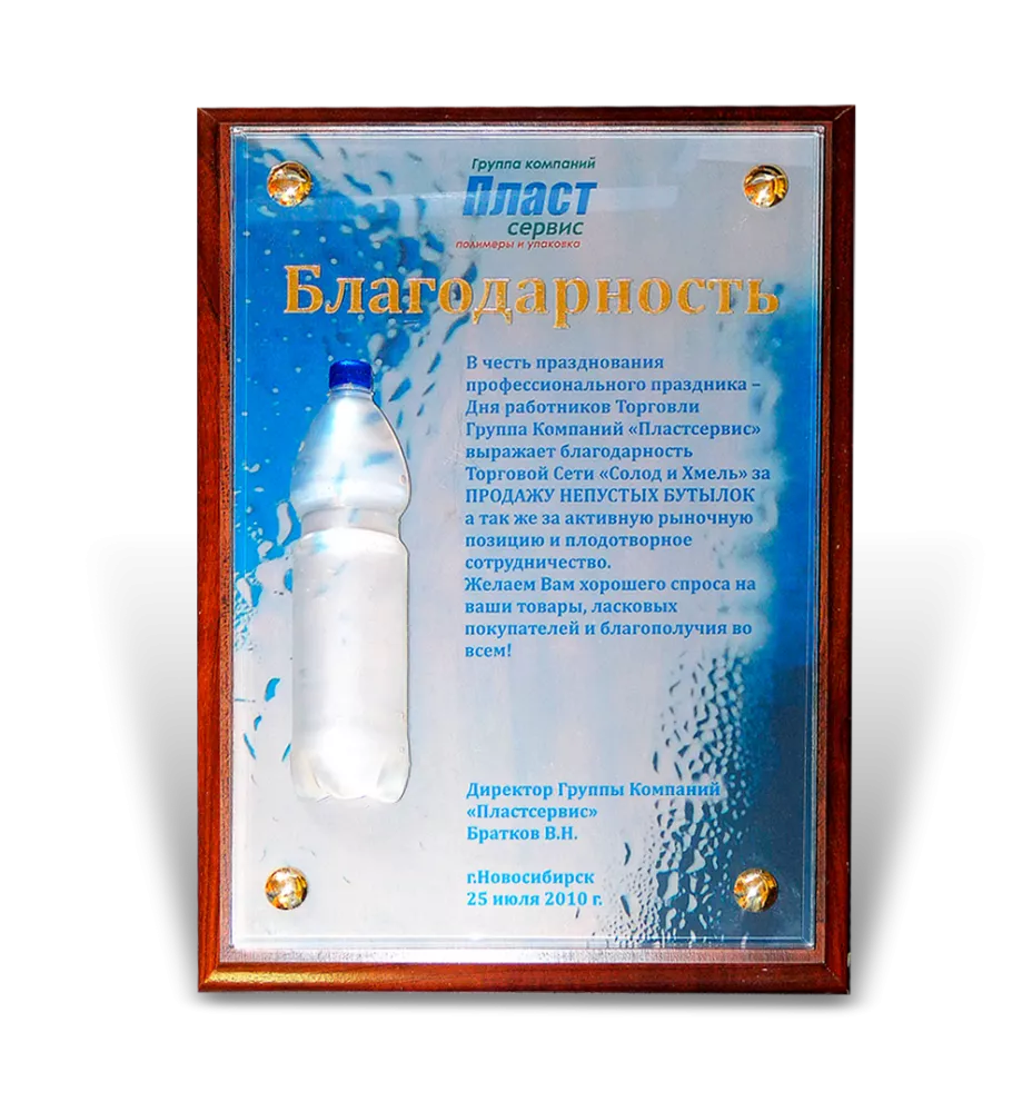 Уникальный диплом, сочетающий все разнообразие технологий в работе со стеклом. Обратная сторона стеклянного листа запечатана полноцветным изображением. Накладка в виде бутылки сделана из акрила. Для нанесения надписи использовался цветной принт и гравировка с закрашиванием. Для соединения деревянной и стеклянной деталей применено винтовое соединение по четырем углам диплома.