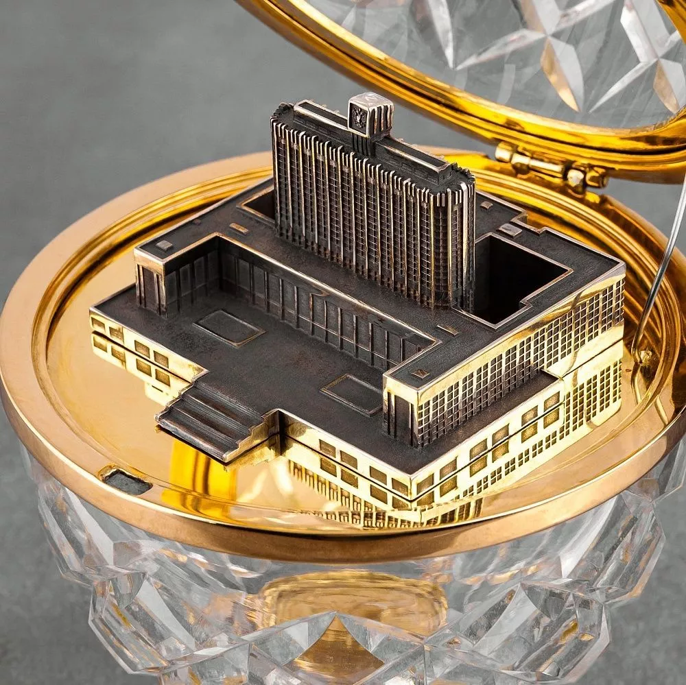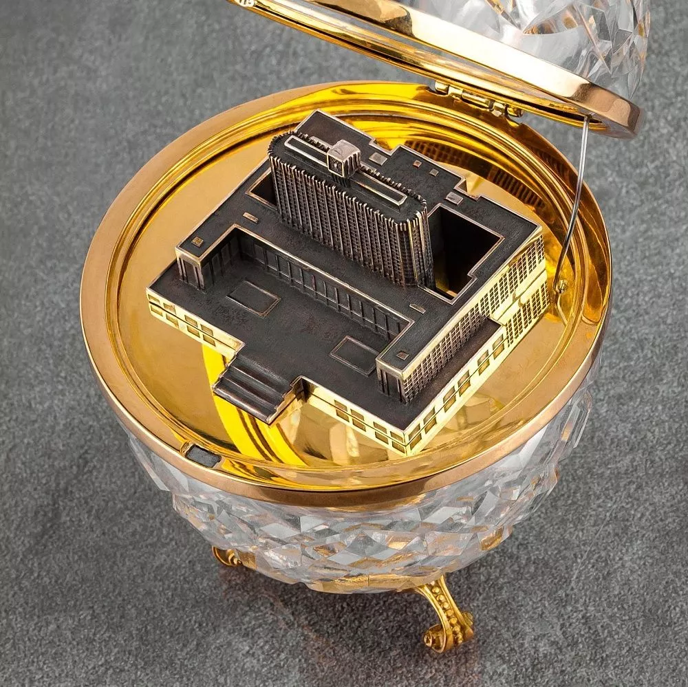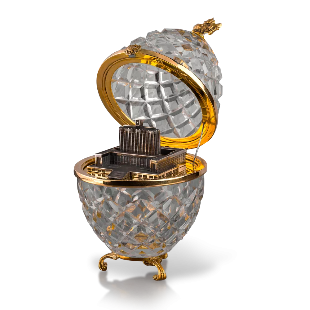Подставка в стиле барокко с тремя гнутыми ножками из полированной латуни. Внутри яйца размещается миниатюрная копия государственного учреждения, созданная с помощью точного 3D моделирования и литейных техник из латуни с патинированием, что придает изделию богатство текстур и выразительность. Эта миниатюра подчеркивает символизм, важность и уникальность подарка.