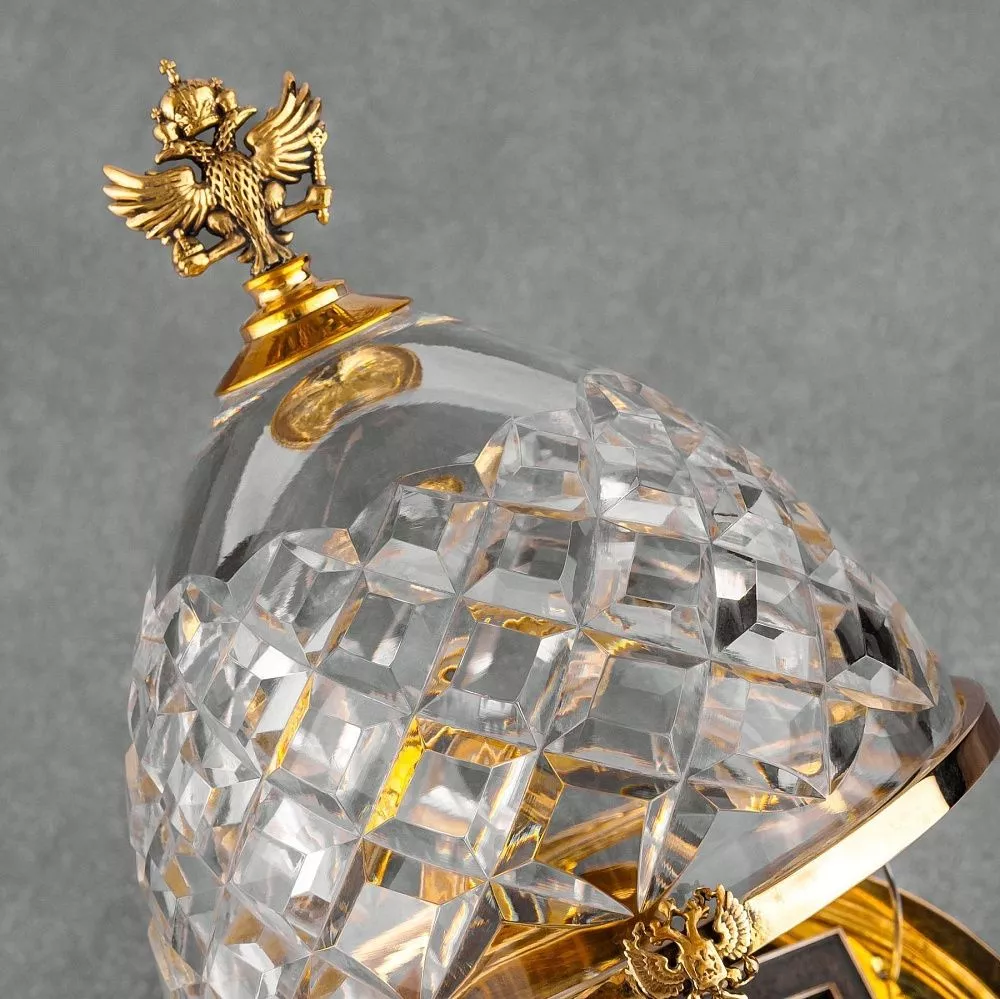 Ободки для хрустальных элементов и внутренняя подставка выполнены из полированной латуни, идеально гармонируя с основным изделием и подчеркивая его статус. Над верхней частью изделия венчает герб РФ, выполненный с высочайшей детализацией и повторенный на замочке, что подчеркивает официальный и протокольный статус.