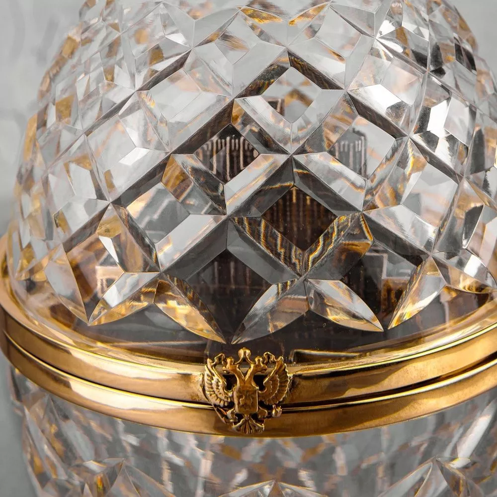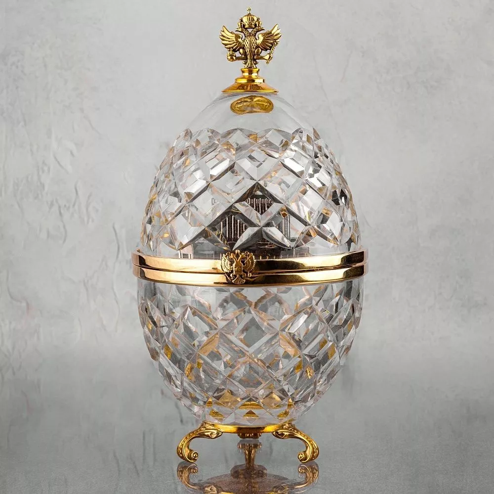 Элитный подарок в стиле Фаберже — это исключительное художественное изделие, воплощающее высокую мастерство и статусность. Центральным элементом является хрустальное яйцо с механизмом открытия и фиксатором крышки, выполненное из высокого качества стекла, изящно дополняемого декоративными элементами.