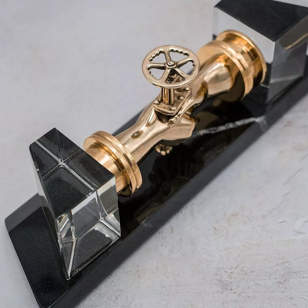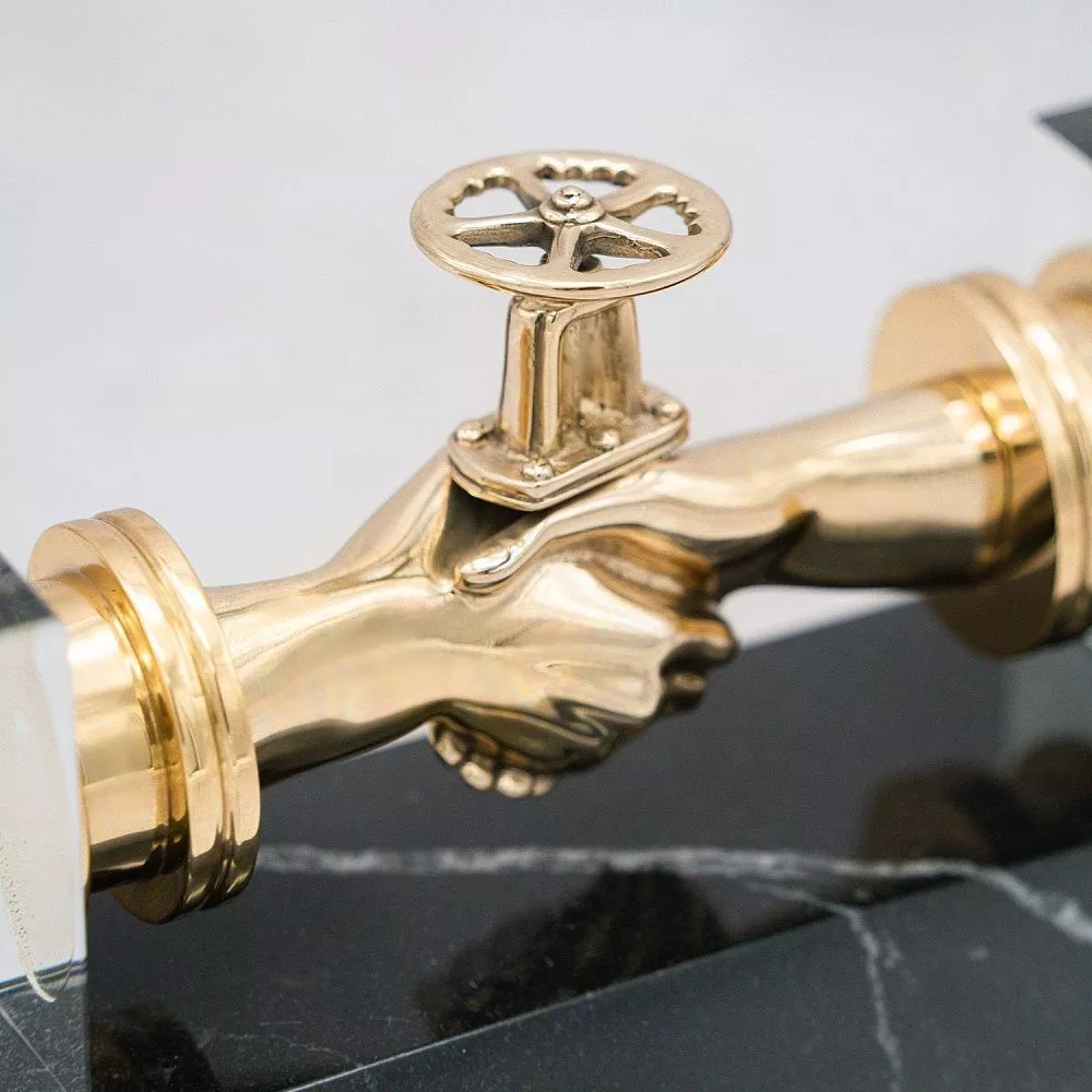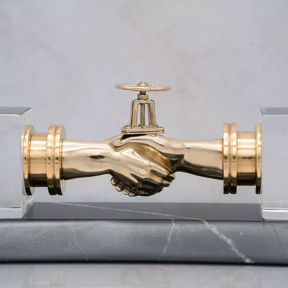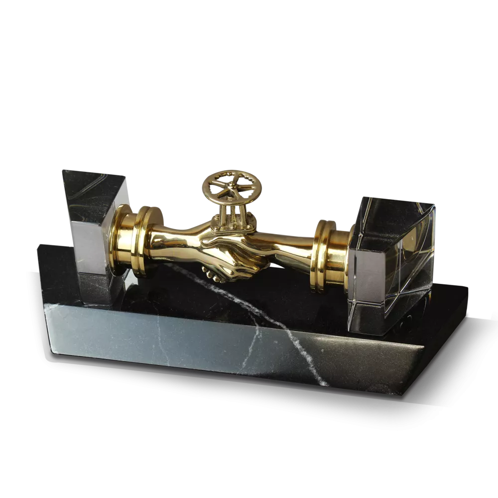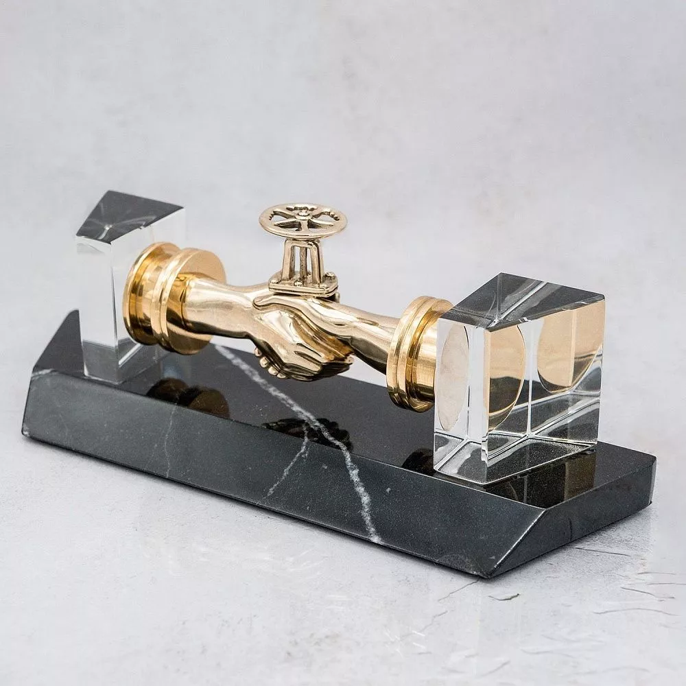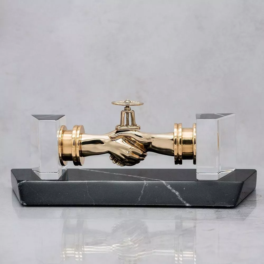 Это выразительное настольное сувенирное изделие выполнено из латуни методом художественного литья и представляет собой символическую композицию соединения нефтегазопровода в виде рукопожатия. В центре композиции — стилизованное объединение трубопровода, символизирующее сотрудничество, доверие и партнерство.