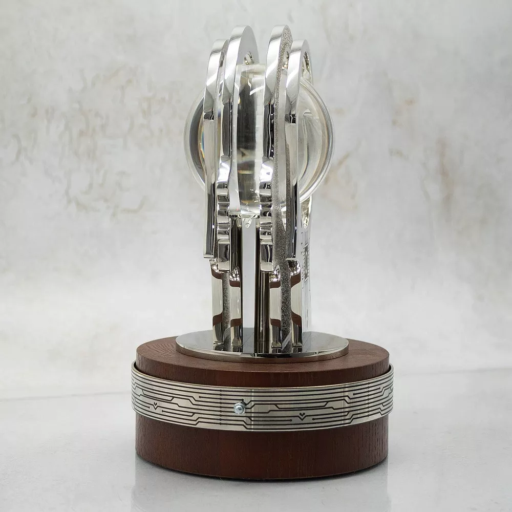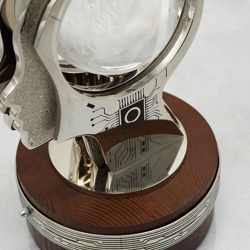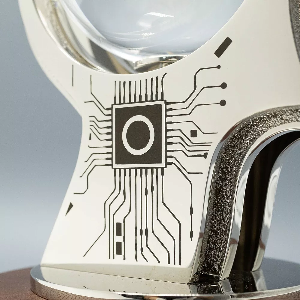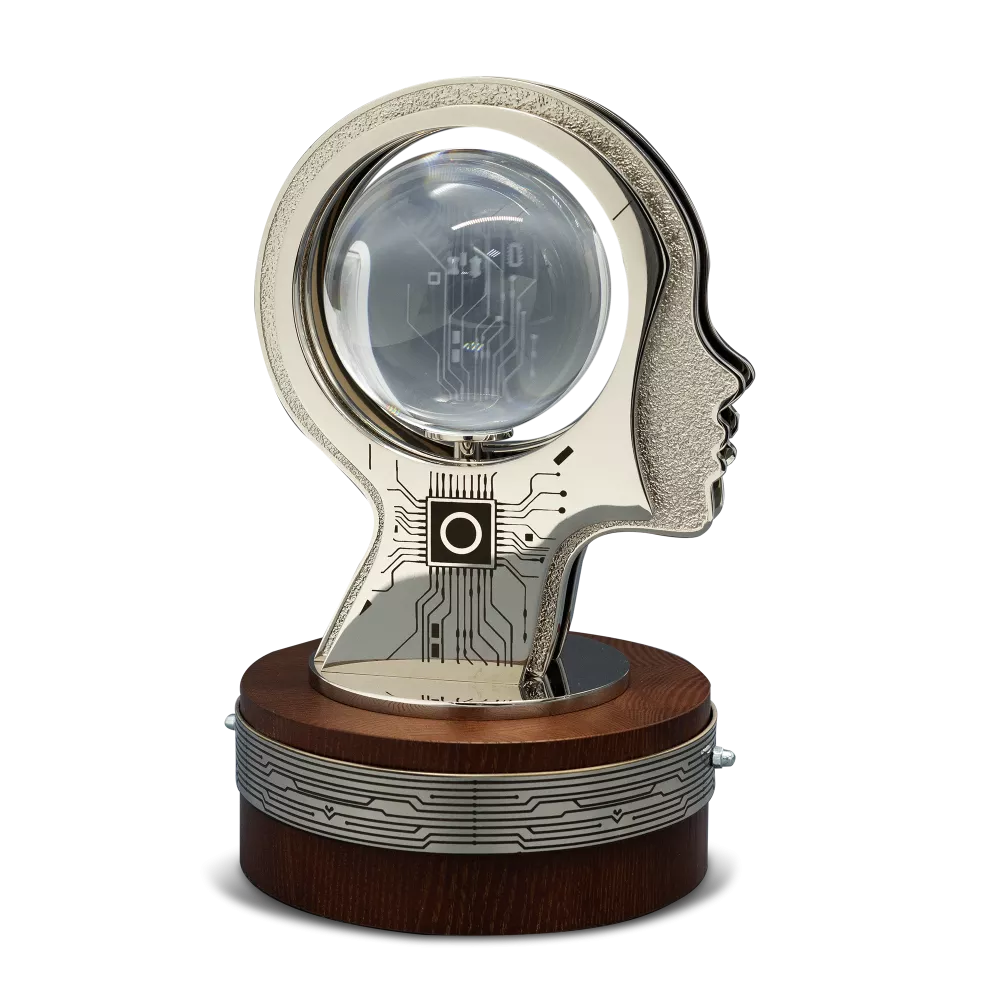 Подарочный сувенир-композиция для IT-специалиста выполнена из никелированной листовой латуни, оптического стекла и массива дерева. Центральный элемент — голова-силуэт из полированного металла, внутри которой расположена стеклянная сфера с 3D-гравировкой, изображающая структурные элементы и логические операции. Основание представляет собой компактную шайбу из натурального дерева, окружённую серебристым обручем, на котором размещены черные принты с IT-символикой.