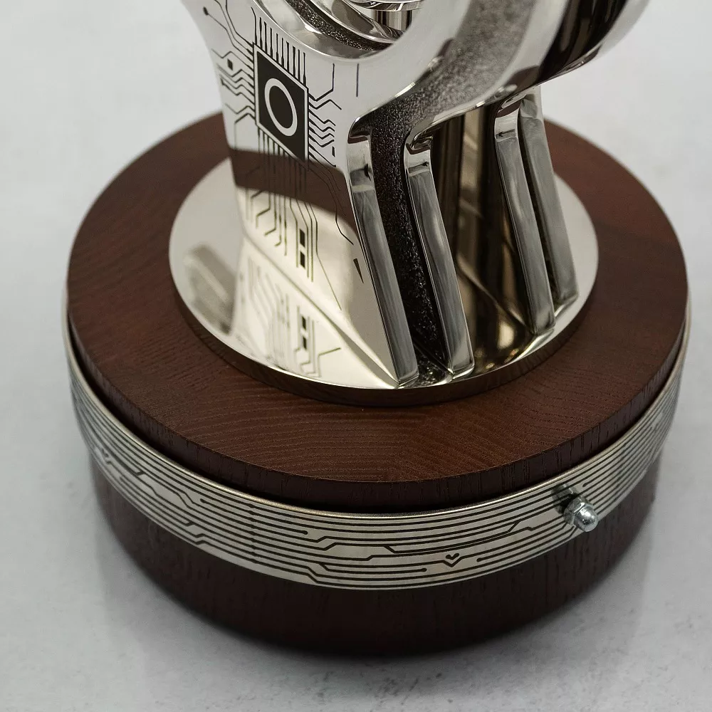 Персонализация и оформление: на основании можно разместить лазерную гравировку имени лауреата, должности, даты достижения или логотипа компании; дополнительно возможно нанесение графического принта на поверхность головы или на дерево. В комплектации предусмотрены варианты цветового тона дерева и отделки металла, чтобы соответствовать фирменному стилю или конкретной тематике мероприятия.