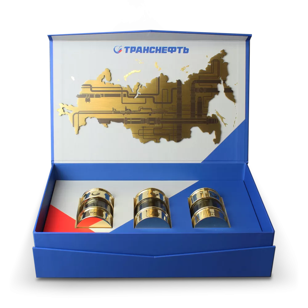 Предлагаем уникальный сувенирный набор с тремя миниатюрными "баррелями", выполненными с высокой точностью и оформленными в стильной коробке с российской символикой. Этот набор является отличным примером подарков ко дню нефтяника и газовика.
