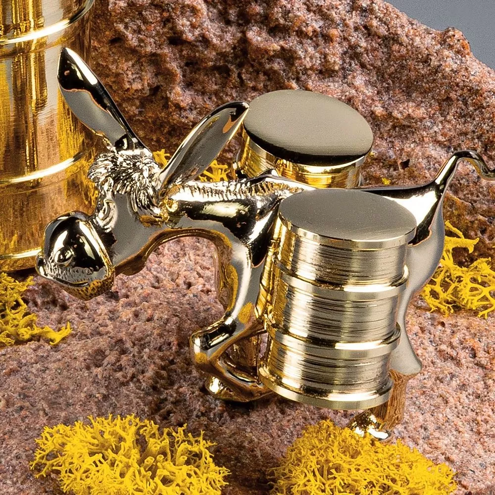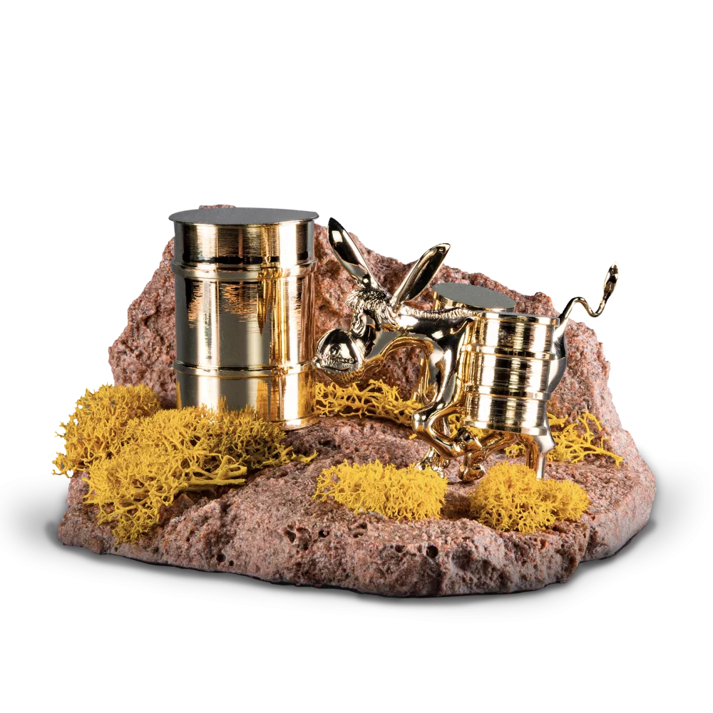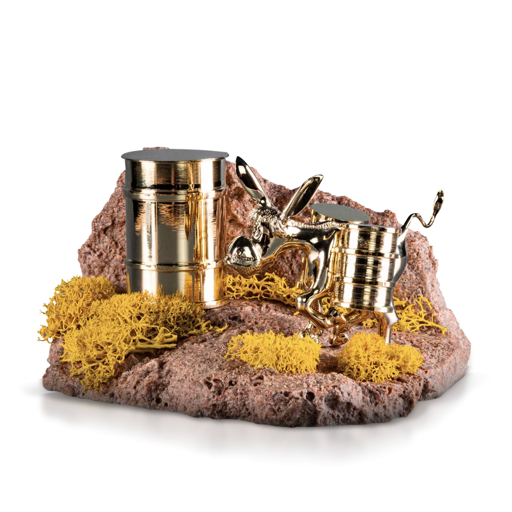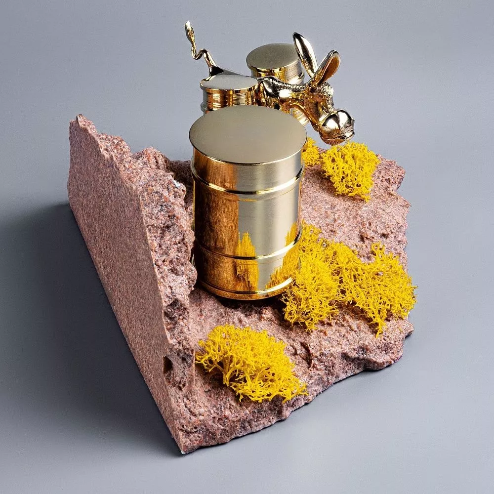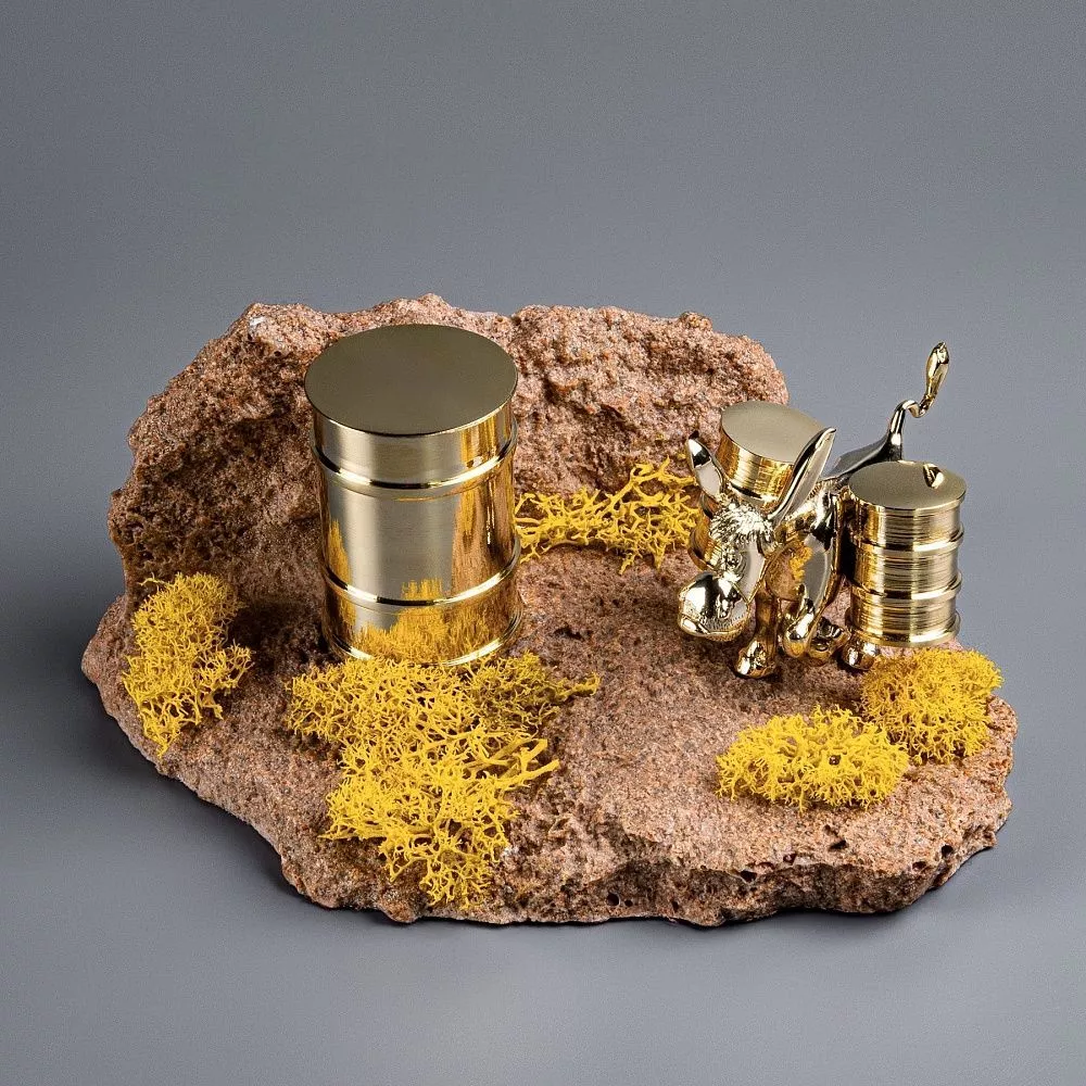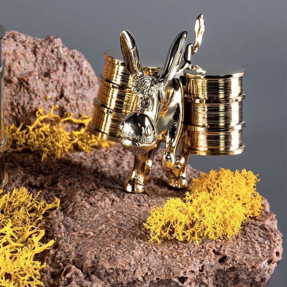 Сувенирная инсталляция «История добычи нефти» изображает пейзаж пустыни, выполненный с искусной имитацией природного камня и верблюжьей колючки. В центре композиции — ослик, нагруженный баррелями нефти, который движется к символическому нефтехранилищу. Фигурки выполнены из латуни с тщательной полировкой, что придает сцене благородный блеск и выразительную фактурность. На постаменте предусмотрено место для персонализации.
