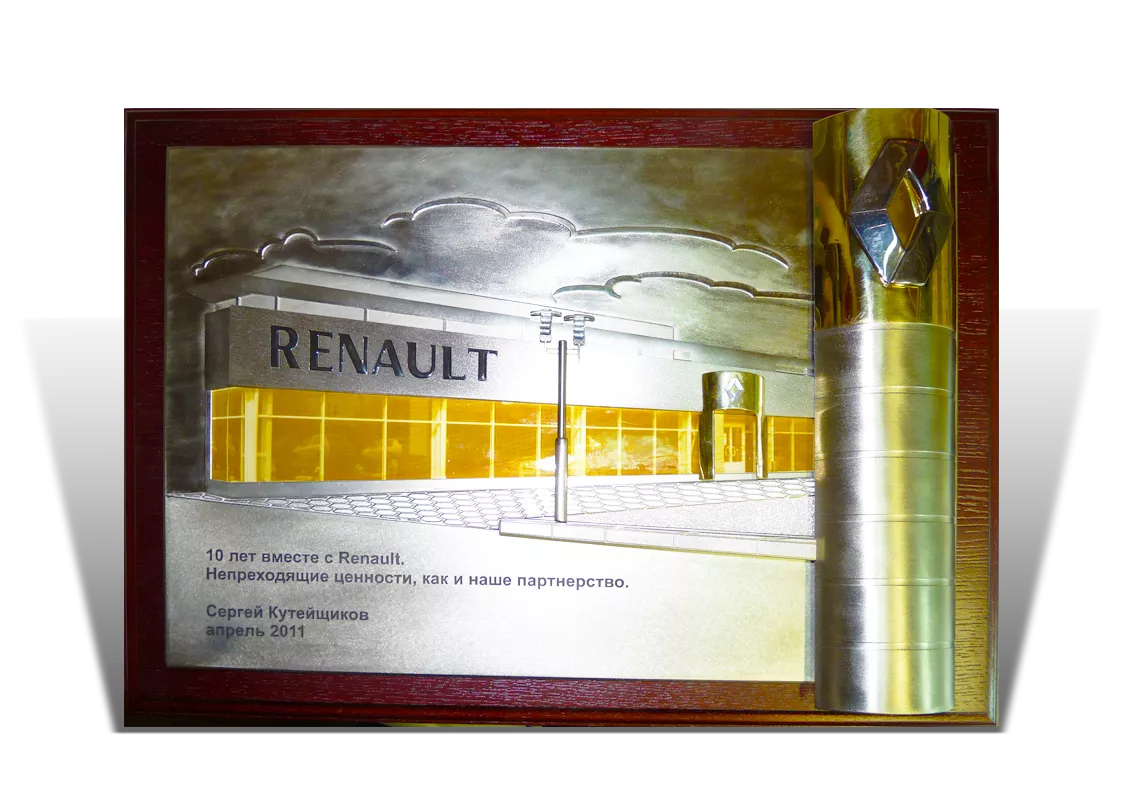 Наградной диплом для автомобильного концерна «Рено» - это высокотехнологичное сувенирное изделие, которое смело можно отнести к разряду гравюр. В изготовлении использовалось множество техник - формовка (резка и гибка) металла, художественная гравюра, химическая обработка металла, литье, лазерная гравировка. Необычный дизайн и качественное изготовление – визитная карточка Студии ART4you.