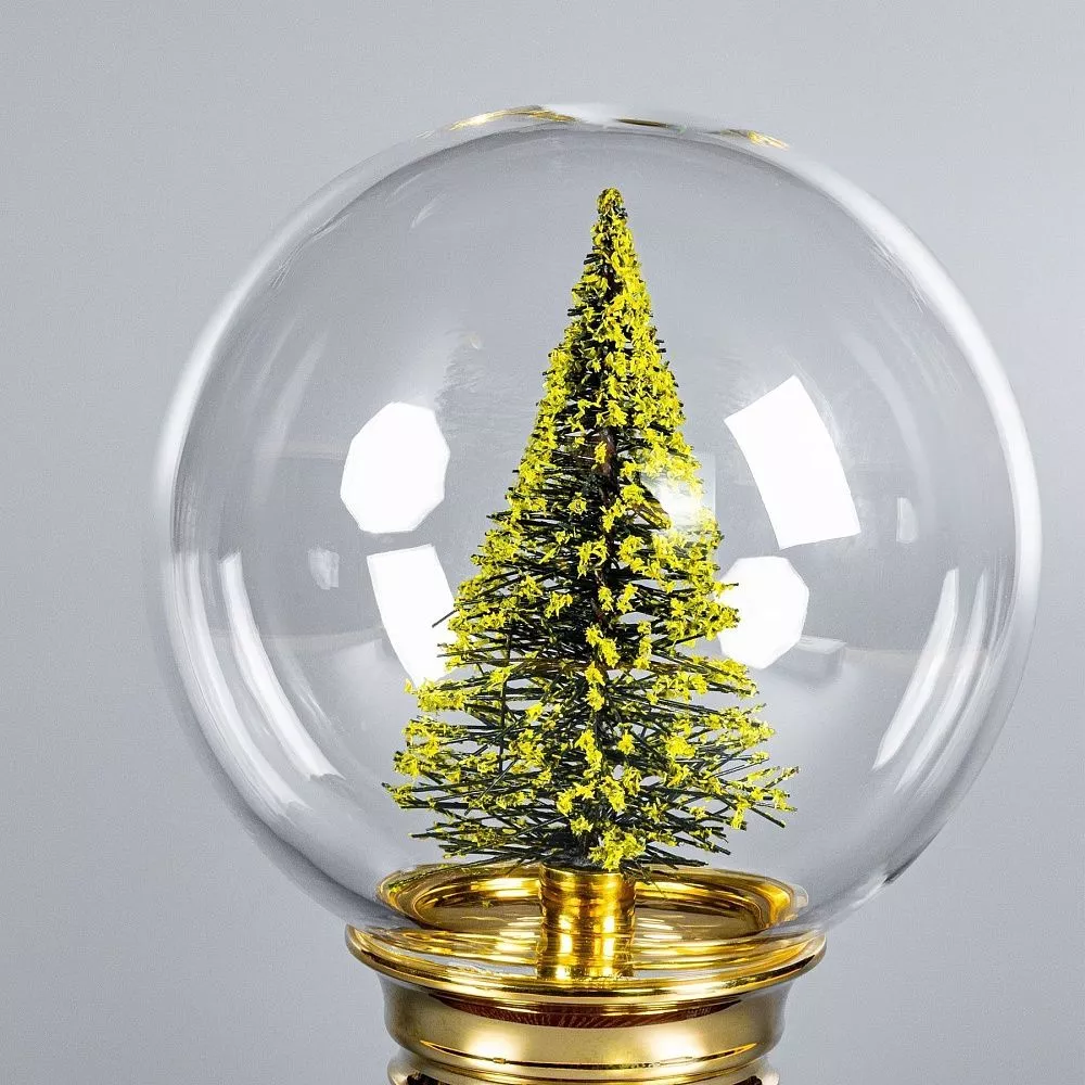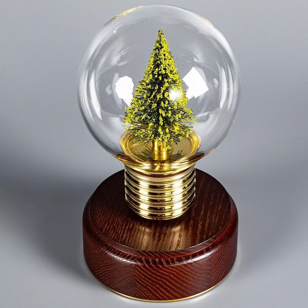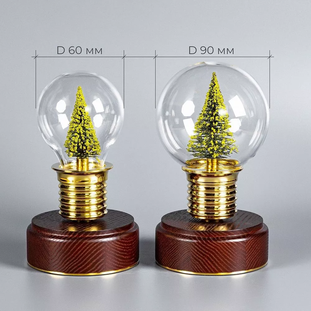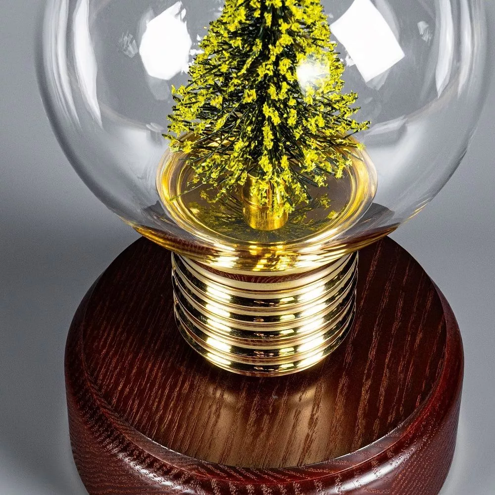 Дизайн сочетает строгую геометрию классической лампочки с праздничной символикой: лаконичные формы, чистые контуры и блестящие контрасты материалов — металла, стекла и дерева. Прозрачная сфера подчёркивает светлый отблеск елочки внутри, а золотистый цоколь добавляет статусности и торжественности композиции. Такая композиция органично смотрится как в офисной среде, так и в домашнем интерьере, внося нотку элегантности и праздничности.