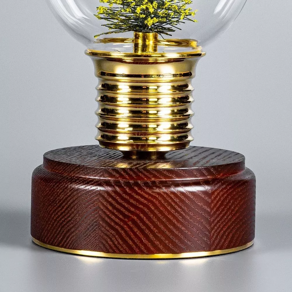 Подарок к Дню энергетика. Настольный сувенир выполнен в виде лампочки накаливания традиционной формы. Цоколь изделия — золотистая полированная латунь, сфера — прозрачное стекло. Внутри размещена новогодняя елочка. Постамент из массива дерева сохраняет естественную структуру древесины и покрыт прозрачным тонированным лаком. День энергетика 22 декабря выпадает на самую долгую ночь в году, а ещё это канун Нового года, поэтому в одном изделии объединены два символа праздника.