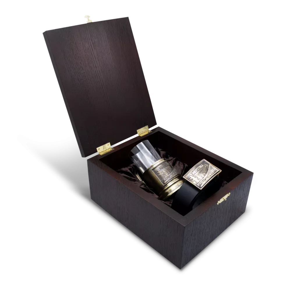 - Деревянный футляр из массива темного дерева. Латунная фурнитура, идеально подогнанный бархатный ложемент, точные замки. Футляр сам по себе предмет искусства — он будет хранить набор десятилетиями, защищая от времени и внешних воздействий. На футляре возможна персонализация: гравировка с именем, датой, названием компании или словами благодарности.