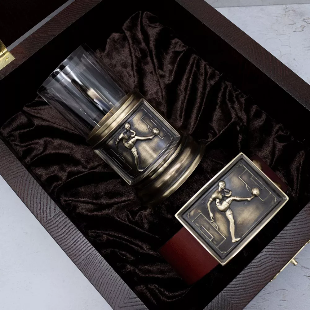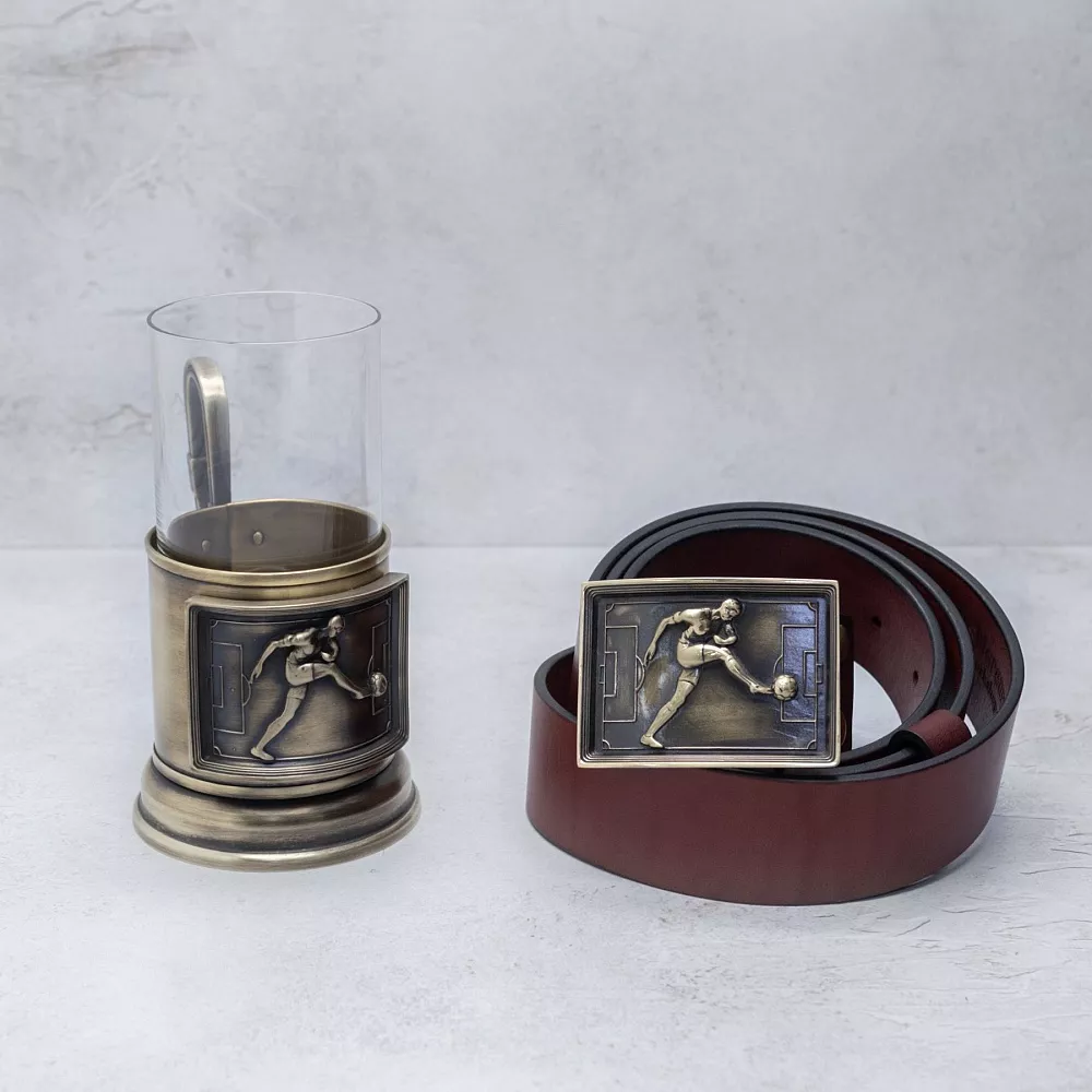 Премиальные материалы (кожа, бронза, латунь, дерево) и ручная работа превращают набор в статусную вещь с историей, достойную стать семейной реликвией. Ремень и подстаканник с единым рисунком создают продуманный ансамбль для настоящих ценителей футбола и качественных аксессуаров.