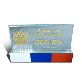 Эксклюзивный приз из стекла создан специально для одного из адвокатов Саратовской области. По заказу друзей и коллег получателя разработан лаконичный сувенир, декорированный российским триколором. Выразительная надпись и российский герб подчеркивают образ солидного человека с высокими достижениями. «GiftArtel» может изготовить аналогичный приз для любого юбилея или профессионального праздника. Предлагаем гравировку с заполнением и без, запечатку тыльной поверхности изделий, полноцветные принты и другие варианты декора. Также вы можете стать соавтором эксклюзивного приза и предложить свою идею дизайнеру «GiftArtel».