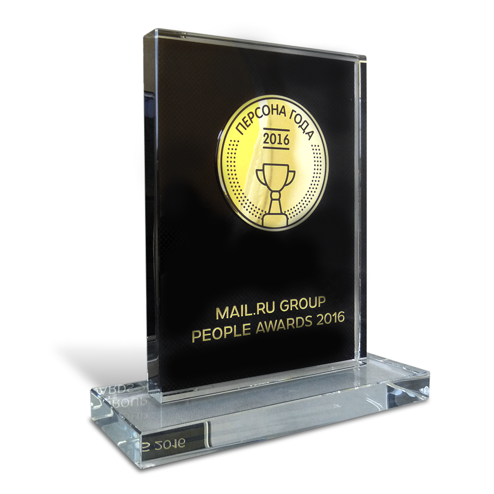 Крупный холдинг Mail.RU регулярно проводит награждение наиболее заметных персон по итогам года. Для победителей разработаны стильные представительные сувениры. Сдержанная гамма подчеркивает серьезность премии. Награда выполнена из прочного оптического стекла. На него нанесены изображения и надписи с применением современной технологии – УФ-печати. Это обеспечивает долговечность и устойчивость покрытия и красок. Такие награды дополняют элементами персонификации. В студии «GiftArtel» можно купить призы для мероприятий высокого уровня.