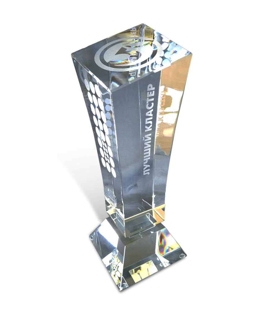 Приз «Пятерочка» был создан нами по заказу одноименной сети супермаркетов для награждения победителей организованного сетью конкурса профессионального мастерства. Выполненный полностью из оптического стекла высокой чистоты и прозрачности, приз имеет высоту 24 см. Сувенир состоит из двух частей. Нижняя, представляющая собой основание, имеет форму усеченной пирамиды, а верхняя, примерно в три раза выше нижней, наоборот, расширяется к верхней части. По бокам верхней части нанесены надписи, содержащие памятную информацию. Верхняя часть приза украшена логотипом фирмы. Используя решения и мотивы этой награды, мы можем создать новый сувенир с уникальным дизайном. Также мы предлагаем такую услугу, как разработка медалей.