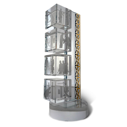 Приз для строительной компании практически полностью выполнен из стекла. Информативная часть - это силуэты строителей по четырем сторонам каждого куба. Силуэты нанесены методом гравировки. Постамент - невысокий цилиндр "шайба". Данное дизайнерское решение является выигрышным и создает визуальное ощущение многоуровневого рабочего процесса. Золотистый орнамент ассоциируется с баней подъемного крана - непременного атрибута строительной отрасли.