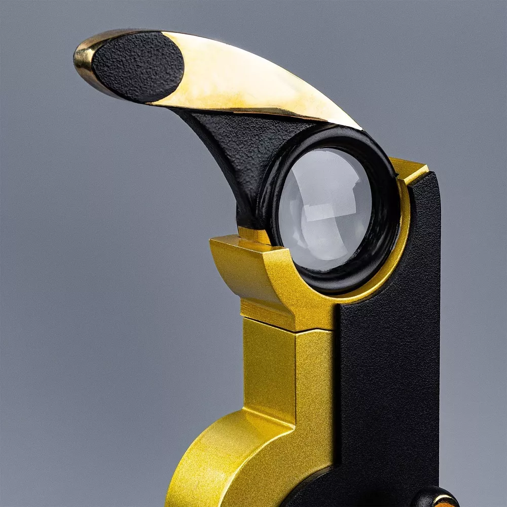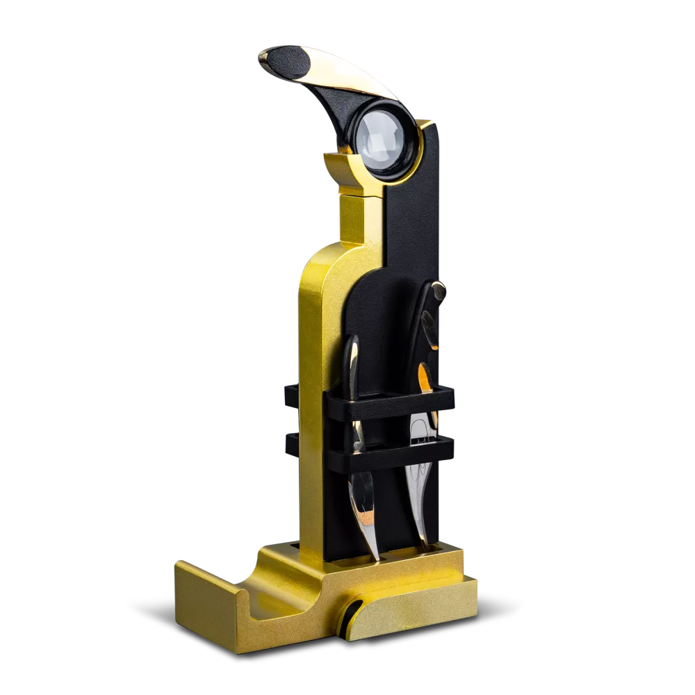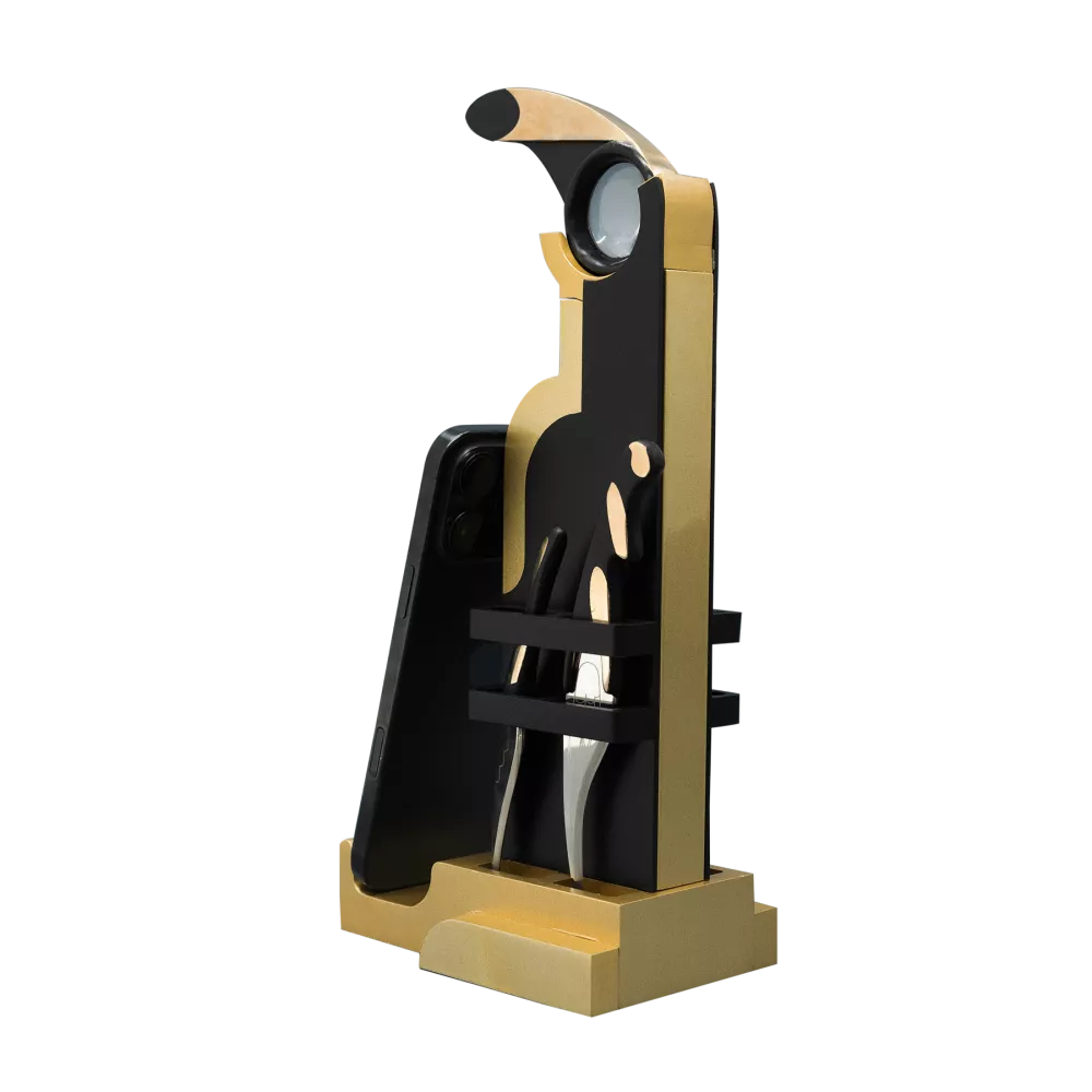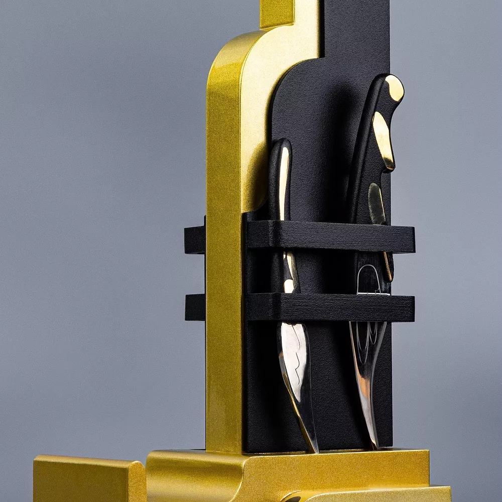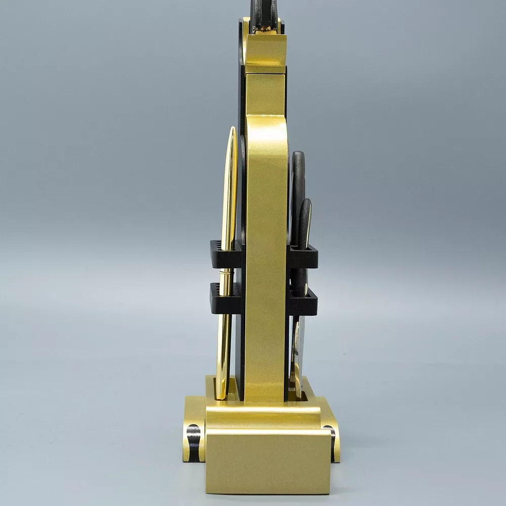 Настольный прибор — подарок для инженера-строителя или архитектора — представляет собой изящную вертикальную металлическую стелу. Конструкция выполнена из качественного материала с фактурным полимерным покрытием, создающим эффект металлика в черно-золотых тонах, вдохновленных классическими строительными инструментами. В стойке предусмотрена система подставок для ручек, карандашей, канцелярских ножей, телефона и лупы, что делает его одновременно стильным и максимально функциональным рабочим аксессуаром.