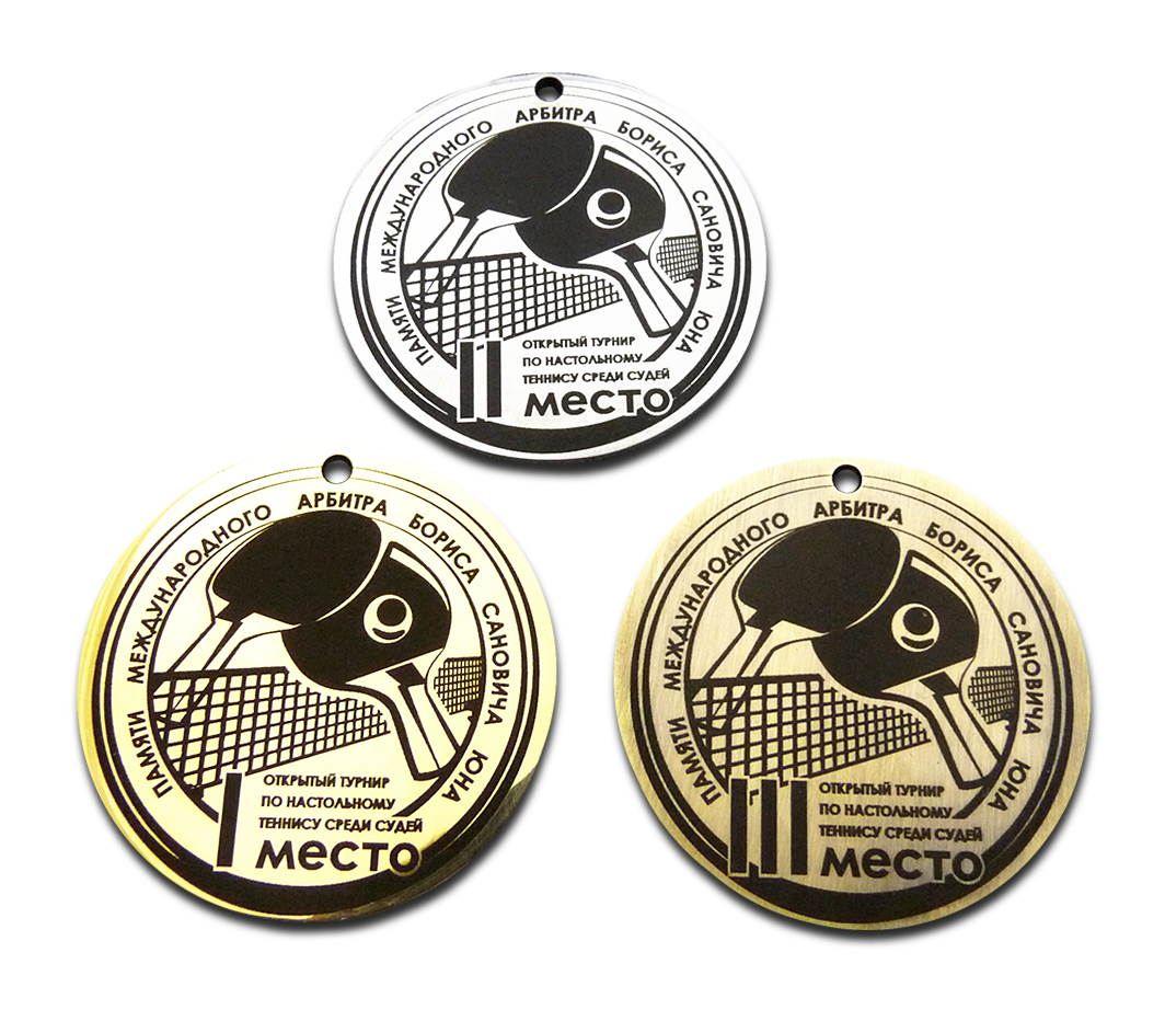 В «GiftArtel» осуществляется разработка медалей. Центром композиции в этих наградах являются ракетки, сетка и мяч для настольного тенниса. Металлические медали выполнены специально для открытого турнира среди судей этого вида спорта. Изделия имеют лаконичное оформление: черные буквы, строгий шрифт и отсутствие цветных элементов. Размеры медалей – 7x7 см.