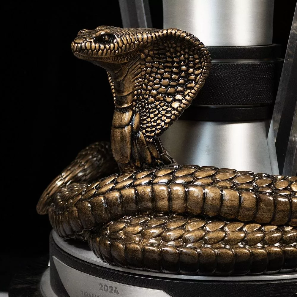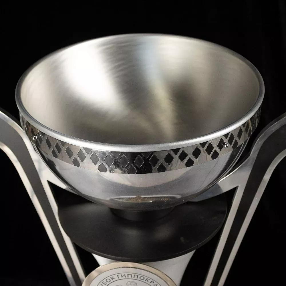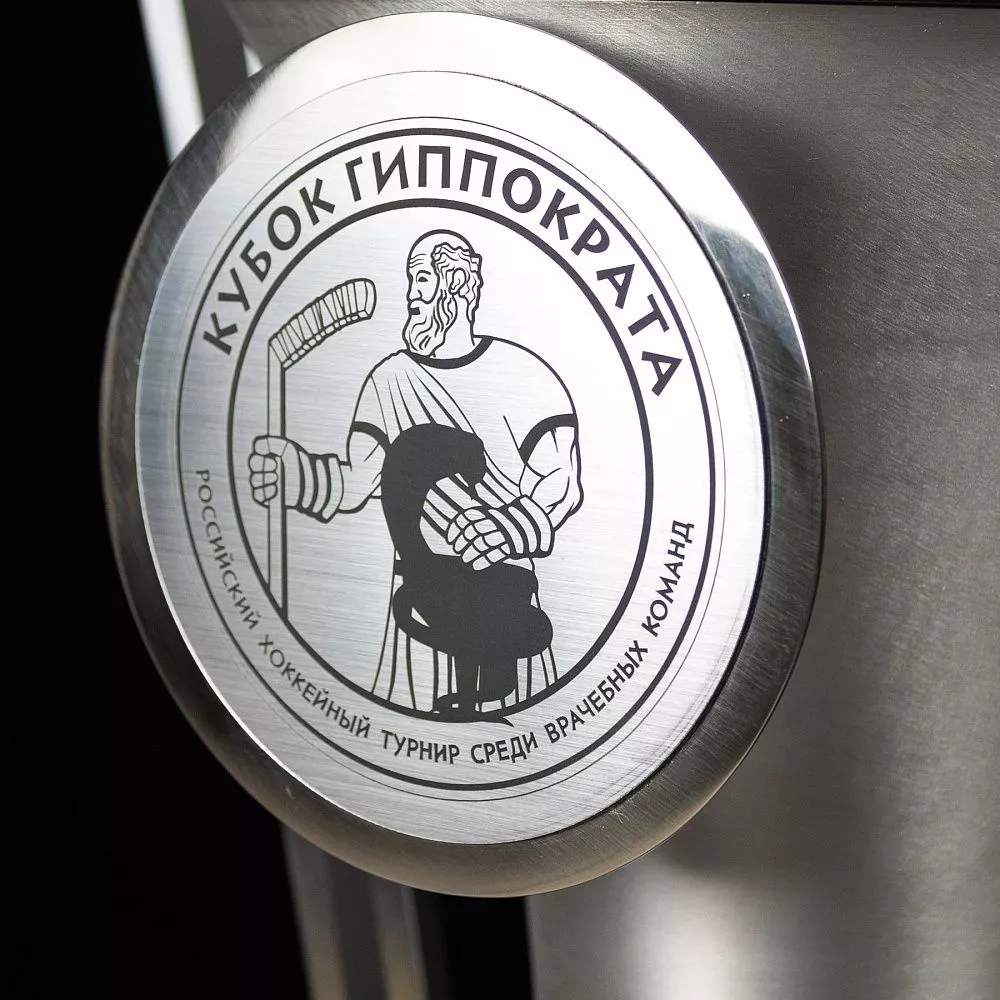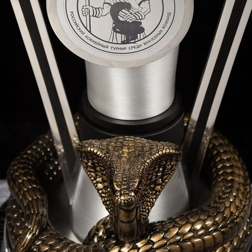 Кубок выполнен из матового серебристого металла, строгого и благородного. Классическая открытая чаша — символ триумфа и признания. Ручки кубка выполнены в виде хоккейных клюшек, что сразу отсылает к ледовой баталии, за которую вручается награда. Но главная деталь — на многоуровневой подставке возвышается бронзовая кобра, отлитая методом художественного литья. Кобра в медицинской символике — не случайна. Овитая вокруг чаши змея — это древний символ медицины, знак мудрости, исцеления и обновления. Здесь она становится стражем победы, объединяя профессиональный код врача и дух хоккейного соперничества. Название турнира нанесено на круглый медальон в основании чаши, что делает каждый кубок уникальным и памятным.
