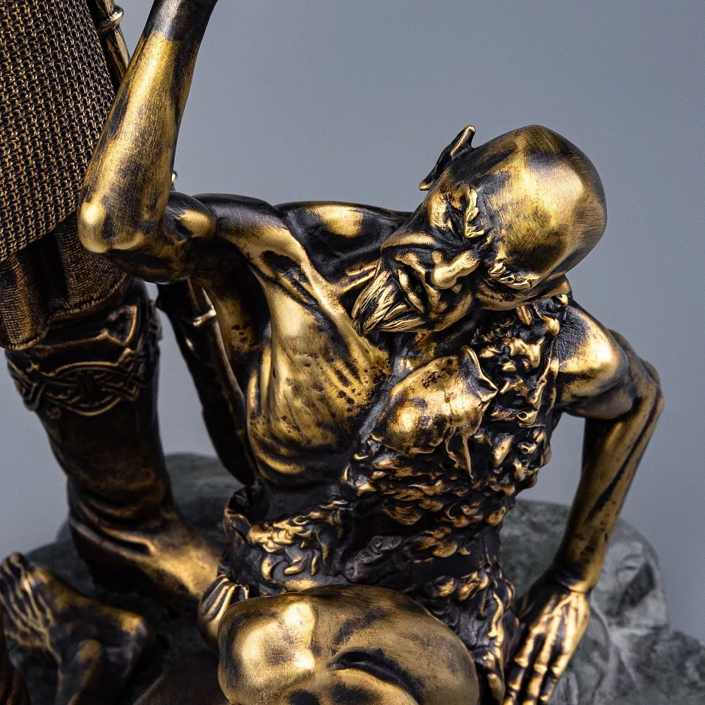 Настольная скульптурная группа "Илья Муромец и Соловей-разбойник" выполнена из бронзы по авторской модели. Глубокая патина подчеркивает фактурность поверхности и деталировку: выражения лиц, доспехи, складки одежды и рельеф основы. Основание в виде каменной глыбы добавляет монументальности и устойчивости композиции.
