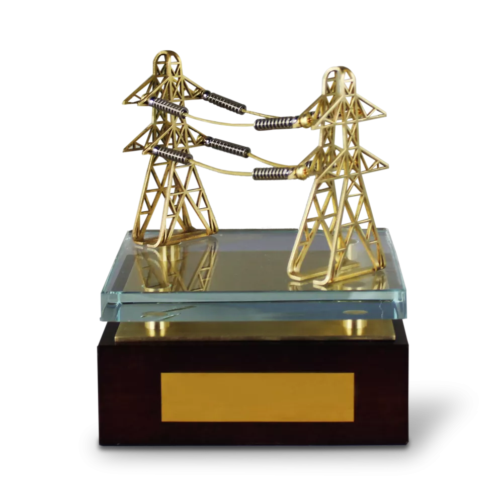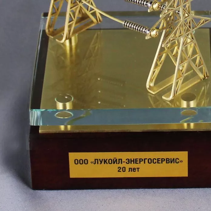 Миниатюрные копии вышек ЛЭП: на постаменте расположены две точных миниатюры высотных линий электропередачи, вырезанные из листовой латуни с помощью лазерных технологий, что гарантирует точное воспроизведение реальных объектов.