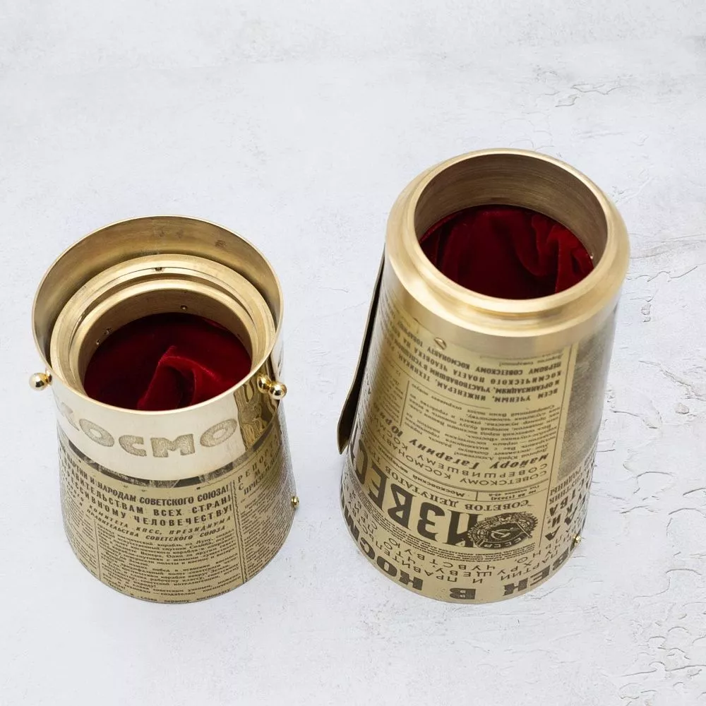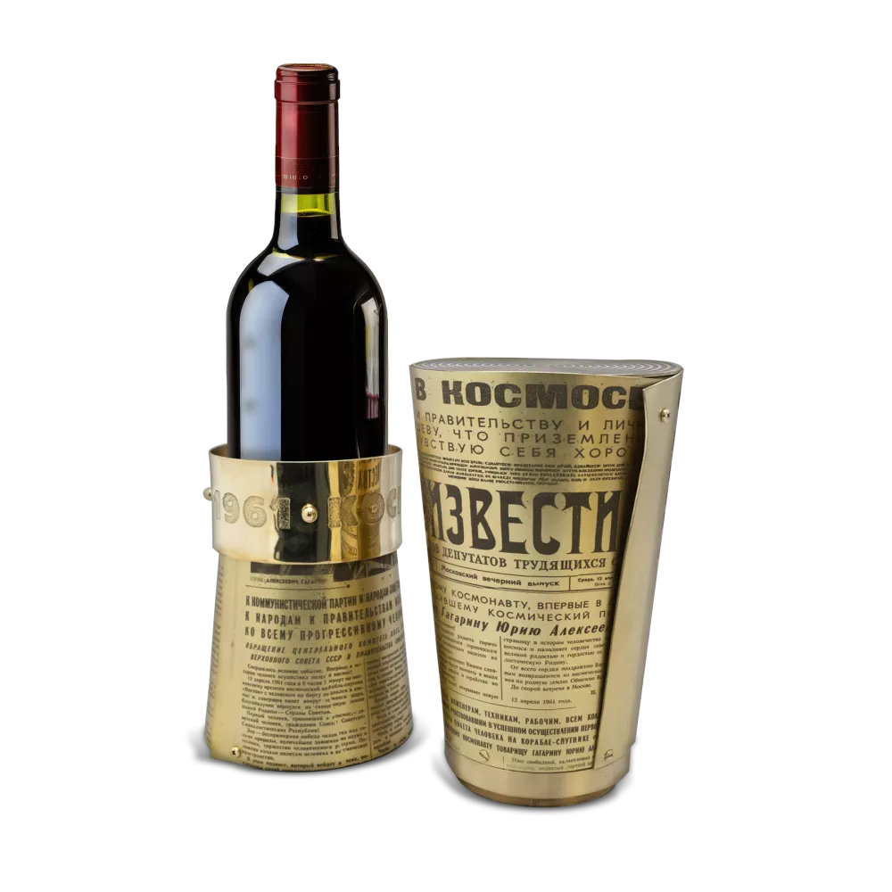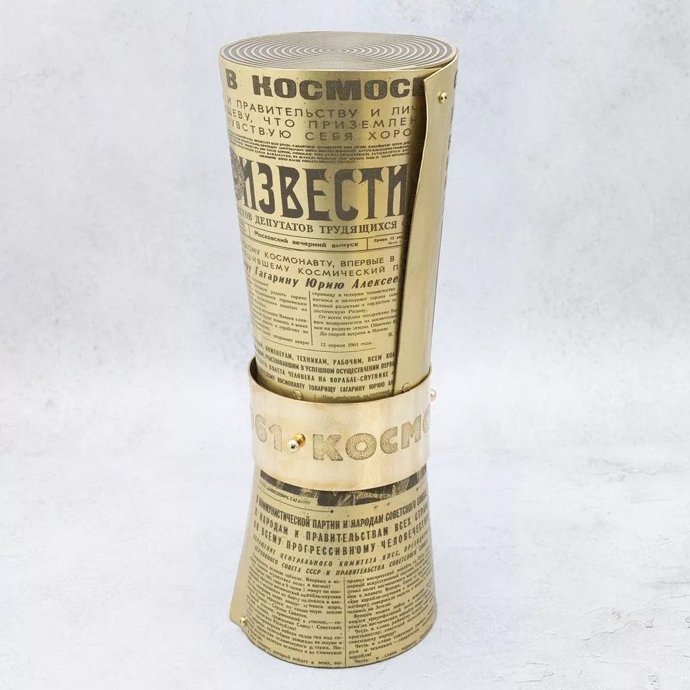 Поверхность латуни матовая, типографика нанесена методом лазерной гравировки с чернением, создающим эффект типографской краски на пожелтевшей газетной бумаге. На пояске, где проходит разъем футляра, выгравирована надпись: «1961 год. Космос». Внутри — красный бархатный ложемент, бережно фиксирующий бутылку.